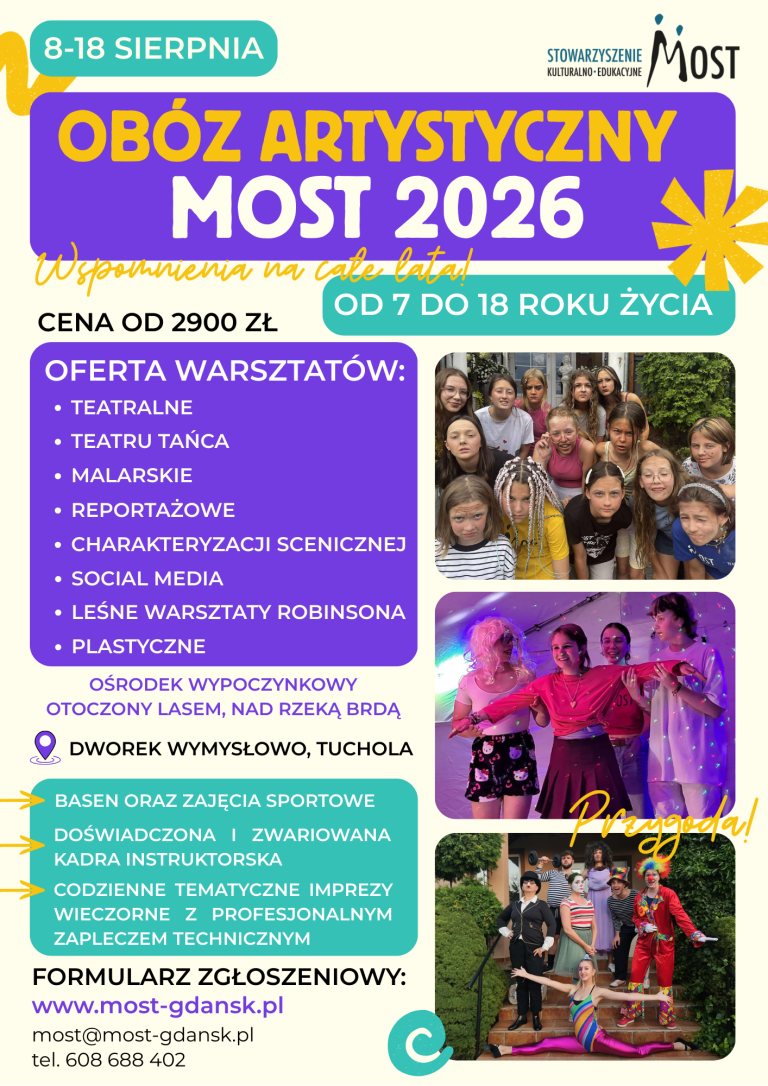 KROK 1Zapoznaj się z dokumentami: Warunki uczestnictwa Regulaminobozu KROK 2Wypełnij online FORMULARZO kwalifikacji decyduje kolejność zgłoszeń i liczba wolnych miejsc. KROK 3Poniżej zamieszczone dokumenty wydrukuj, wypełnij i dostarcz osobiście lub pocztą na adres:Teatr Mostownia ul. Miszewskiego 16, 80-239 Gdańsk Karta kwalifikacyjna Zgoda na leczenie szpitalne Upoważnienie do podawania leków KROK 4Poniżej zamieszczone dokumenty wydrukuj, wypełnij i przekaż organizatorowi w dniu wyjazdu Oświadczenieo stanie zdrowia
